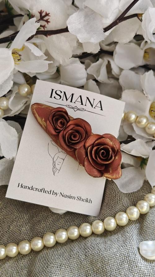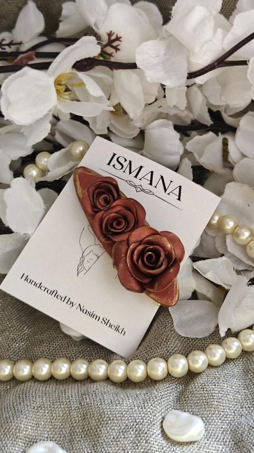 A rich, monochromatic accessory. This barrette is fully coated in a stunning metallic bronze/copper finish. It features a continuous arrangement of three perfectly sculpted 3D roses, giving it a luxurious, antique metallic look. A fantastic piece to complement earthy or dark-toned ethnic wear.