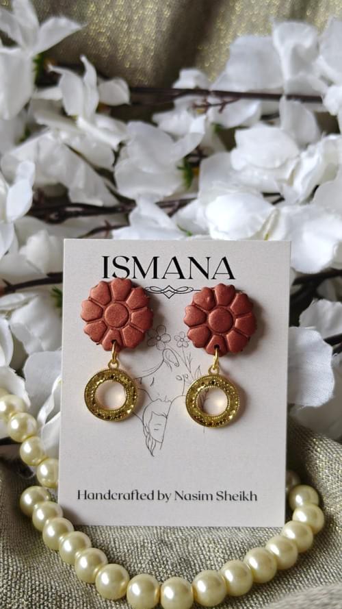 A modern classic combining rustic charm with glam detail. These earrings feature a floral, scalloped stud in a rich, metallic copper finish. They dangle from a contrasting antique gold-tone ring charm with a subtle textured/diamond-cut effect. This piece offers a sophisticated, earthy glow perfect for festive occasions and warm-toned outfits. Material: Premium Polymer Clay, Metallic Copper Pigment, Gold-Tone Metal Charm.