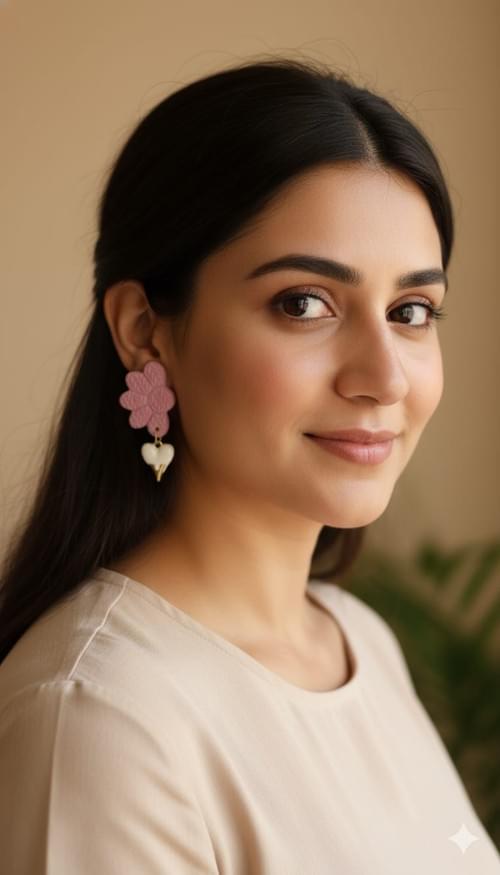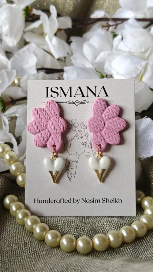 Utterly charming and feminine. The top piece is a six-petal flower in soft blush pink with a subtle knit texture embossed on the petals. It dangles a contrasting white heart charm with a metallic gold tip. A sweet, whimsical piece ideal for a romantic or fun casual look.