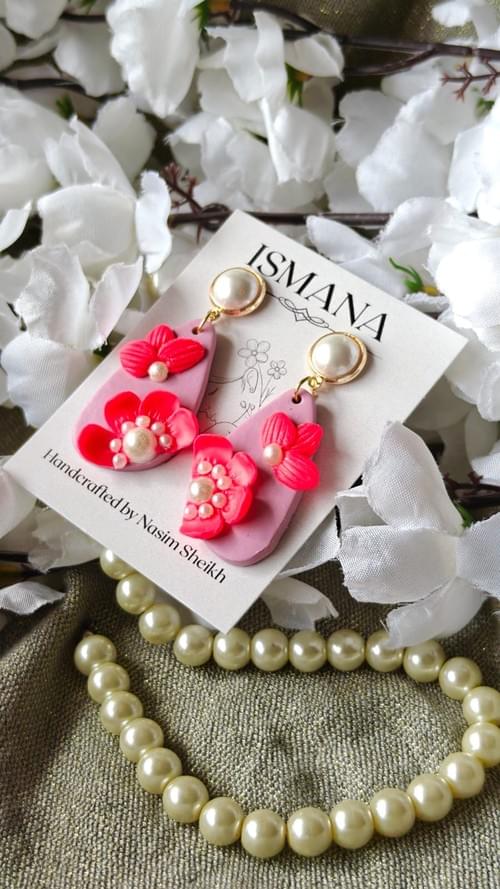 The Gulabi Pearl Bloom Drops are a testament to meticulous hand craftsmanship, designed to add an element of soft glamour to your look. Each teardrop base is carefully sculpted from premium polymer clay in a soothing mauve shade, providing a perfect canvas for the intricate 3D coral-red flowers.