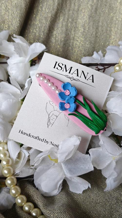 Simple, sweet, and vibrant. The long, soft blush pink base features a central design of two delicate azure blue flower buds with tall green leaves. A delicate line of tiny white pearls edges the top of the barrette, adding a touch of classic elegance.