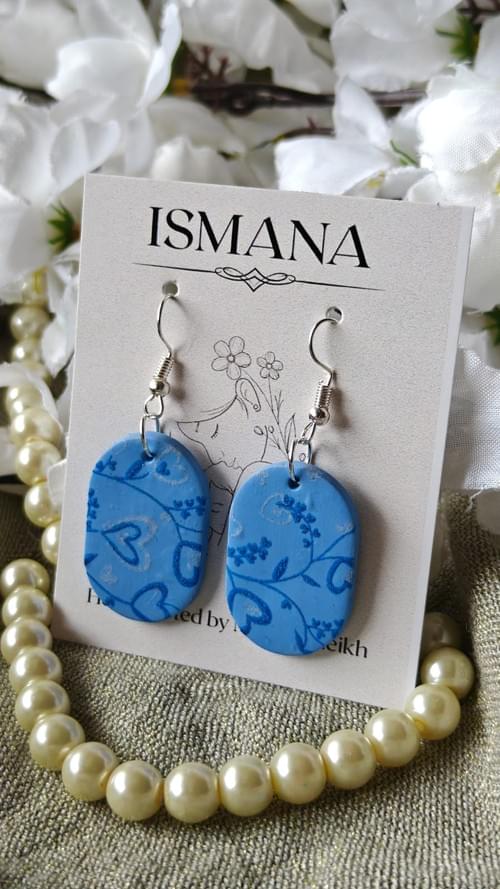 These earrings feature an elegant, scalloped cutout shape crafted in a soft, light-blue clay. The surface is detailed with a subtle floral and heart pattern, mimicking fine porcelain or antique chintz fabric. Perfect for a breezy, feminine, and sophisticated daytime look.