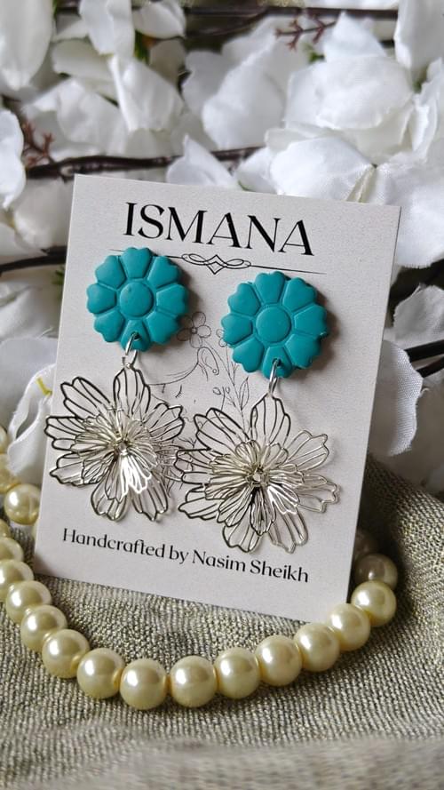 An elegant statement piece inspired by nature's geometry. The earring starts with a solid floral stud in a striking, matte teal polymer clay. It suspends a large, intricate, lightweight silver-tone wire flower charm. The contrast between the solid matte clay and the airy metal wire creates a bold, contemporary look.